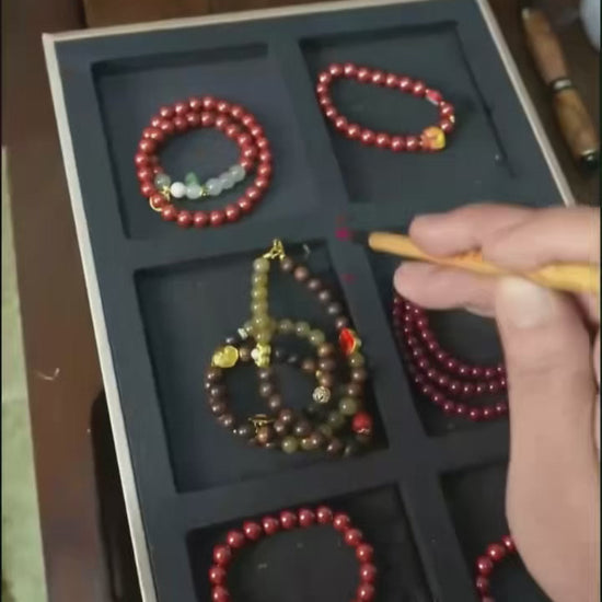 The Taoist Wealth & Prosperity Set is entirely handmade by skilled artisans, with each cinnabar bead and copper pendant carefully crafted through labor-intensive and time-consuming processes. Once completed, Taoist masters from Qingcheng Mountain perform the βWulu Zhaocai Ritualβ (Five-Way Wealth Attraction Ceremony) to consecrate and bless the set. This sacred ritual consumes great spiritual energy, ensuring true fortune and prosperity for the wearer.